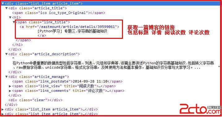 首先须要实现的是通过分析博客源代码获取一篇csdn的文章,在使用IE浏览器按F12或Google Chrome浏览器右键"审查元素"能够分析博客的基本信息.在网页中http://blog.csdn.net/eastmount链接了作者全部的博文.