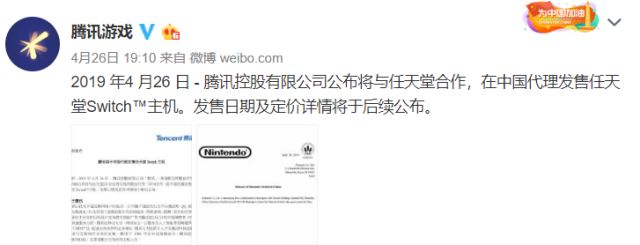 终于在 2019 年 4 月 26 日,腾讯游戏官博正式官宣:腾讯与任天堂合作,在中国代理发售 Switch。