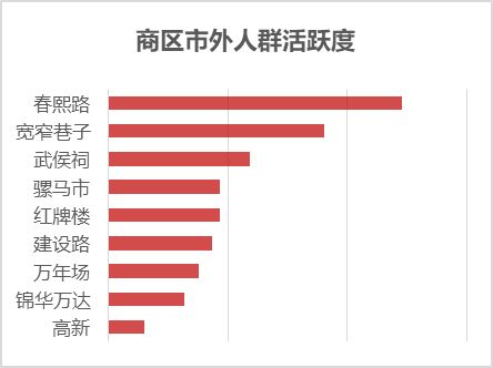 1、从商区客流空间分布上来看,春熙路、宽窄巷子、骡马市、建设路吸引全市各地区客流均较多,属于市级商区;武侯祠、锦华万达、万年场、红牌楼、高新和天府新城属于片区级商区,吸引客流较多来自于附近居民。