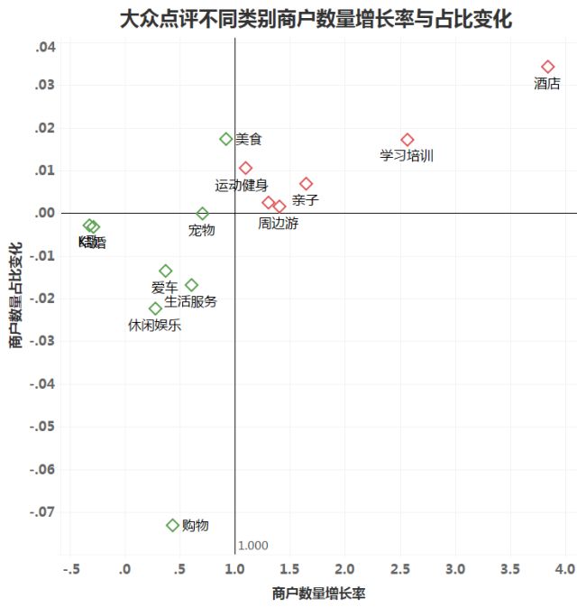 反之,酒店、休闲旅游、亲子以及教育等商户成长快速。其中酒店数在三年间增加了 3.8 倍多,学习培训的商户数增加了 2.57 倍,亲子以及周边游等也分别增加了 1.65 倍和 1.4 倍。可以发现,休闲旅游、亲子教育等新兴业态“发展壮大”,传统服务型商业则面临挑战。