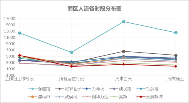 其中,春熙路各时段人流量都远远超过其它商区,表明了春熙路作为老牌商圈在成都不可撼动的中心地位。