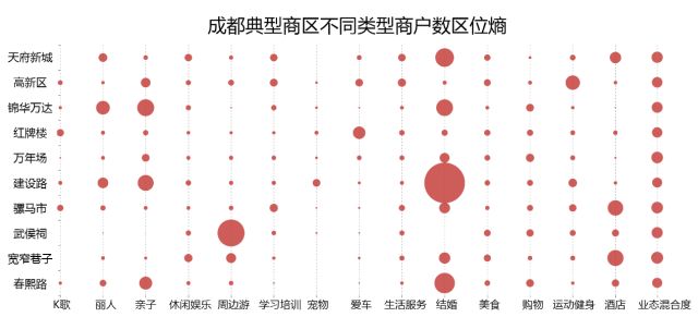 仅从购物一栏无法看出十大商区在实体零售上的差别,根据购物商品类别进行了细分后可以发现,不仅仅是婚纱摄影,亲子购物、化妆品以及珠宝也是热门商区的首选。市中心春熙路的化妆品和珠宝饰品、锦华万达的亲子购物与鞋包服饰、建设路的亲子购物、武侯祠的花店、仿佛都是为女性和儿童准备的。