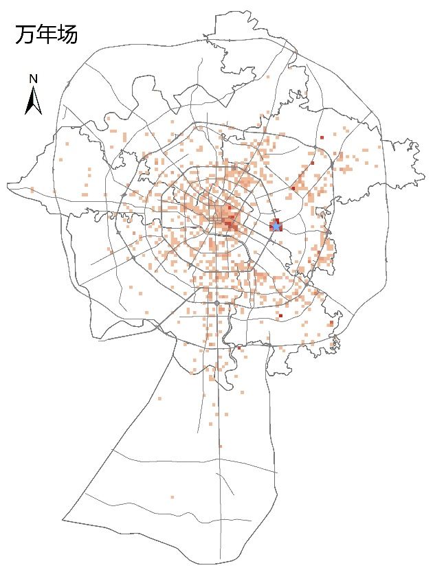 3、 各商圈有各自较为明显的辐射地:宽窄巷子的主要客流来源于旅客居住集中的春熙路;天府新城主要来源于高新区和南部的居民区。而锦华万达则对东南三环外的居民形成一定辐射。