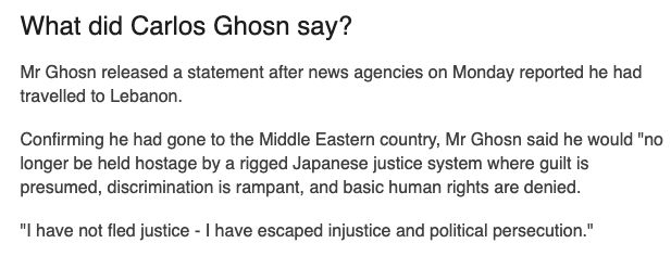 Ghosn 本人随后做出了回应,他说,自己并不是在逃避正义的审判,而是在远离不公和政治迫害,并抨击了日本司法系统对自己的「有罪推定、猖獗的歧视行为和对基本人权的否认」。