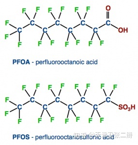 PFOA 和 PFOS 则是另外一种小分子有机物,PFOS 是 PFOA 的磺化产物: