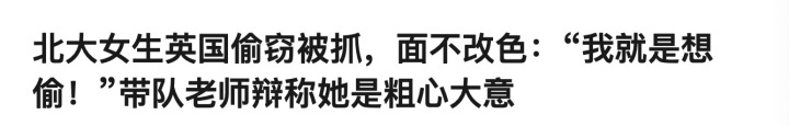 1·2018 年, 北京大学的女学生跟着老师去英国参加交换学习活动,在一家商店里偷东西被抓到,哪怕老师一再想方设法的向店家求情道歉,店家也没有接受其道歉,她所心仪的爱丁堡大学也表示不会接受她的后续留学申请。