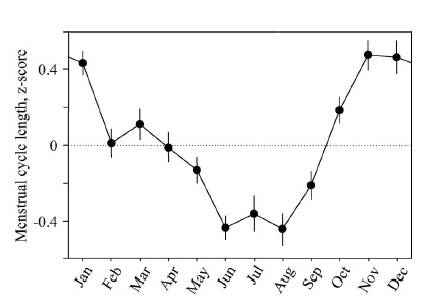 发现日照充足的夏天,月经周期相对较短,冬天的时候最长,春天和秋天由于日照差不多,所以月经周期也差不多!