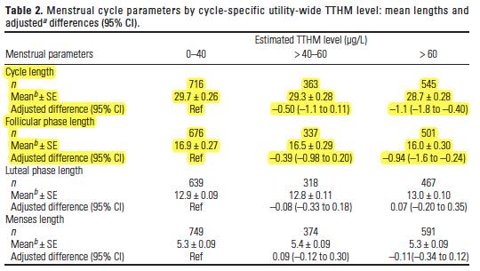 一群美国的科学家们为了了解饮用水中的氯化物对卵巢功能的影响,随访了 403 例女性,平均每个人随访了 5 个月经周期,他们随访了这些人喝水的情况,洗澡的时间等,发现饮用水中氯化物含量越高,月经周期会变短,而且最主要是影响卵泡期的时间,对黄体期影响不大。