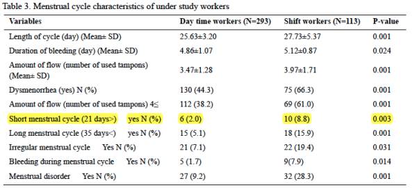 有好奇的科学家们比较了 293 名白班工作的妹子和 113 名上轮班的妹子,发现轮班工作造成很多月经问题,其中就包括了月经周期变短,还有其他的包括月经周期变成的,月经时长时短的,月经中间出血的,痛经的等等问题。