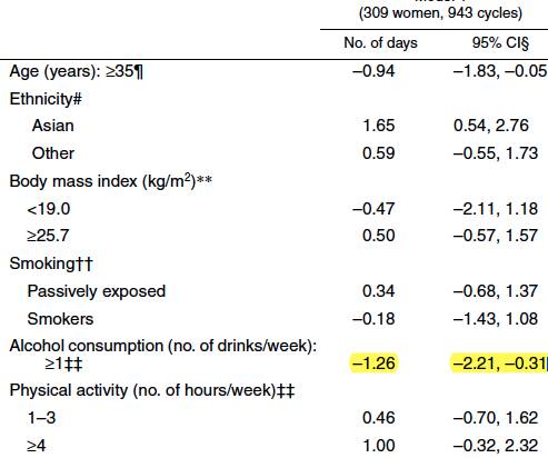相比于不喝酒的妹子,喝酒的妹子月经周期平均要减少 1.26 天。