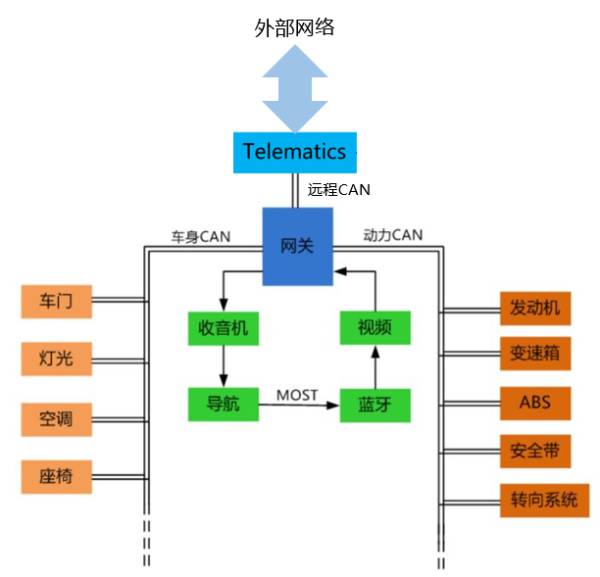 下图是典型的具备车联网功能的汽车的内部网络架构,在目前行业内,无论动力 CAN、车身 CAN 如何变化,要实现车联网的远程功能,一定会有一个 Telematics 节点,即 T-BOX。T-BOX 具备移动通信功能(4G),并将外部的指令转换为能被车内网络识别的 CAN 消息发送到总线上。某种程度上可以认为,(重点)Telematics 节点(T-BOX)是车辆和外部网络通信的唯一节点。
