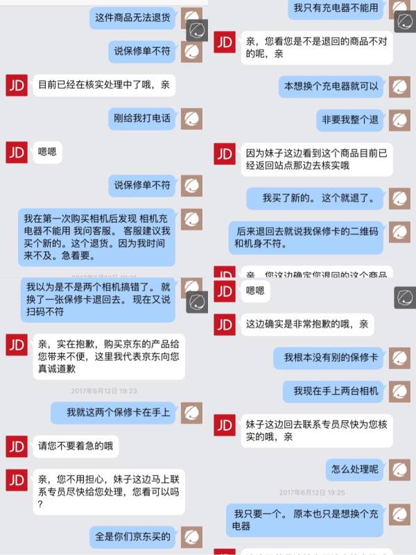 新买的相机充电器有问题,根据客服建议退回后,京东以没收到保修卡为由拒不退货。