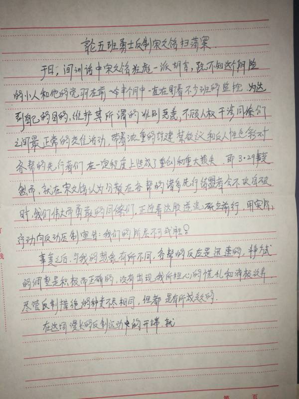 而我们采取的是连结成反抗团体的形式,名称叫「第二共合体」,核心成员二十几名,分上下议院,上院负责方针政策审核,各项会议以及针对学校各种新的侵权行为的快速反应,有五人;下院负责两项主要事务,一个是不定期更新但频次极高的刊物《思想解放》的素材收集,成文与印制,另一项是讽刺学校各种侵犯人权的漫画的绘制与发放。