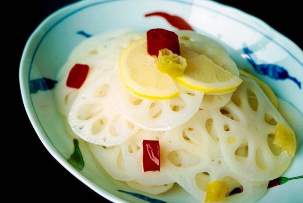 - 柠檬半个切片,放入完全冷却的汤汁里,再加一勺泡椒水(10g),三勺白醋(30g),将藕片放进去浸一夜,就会十分入味。