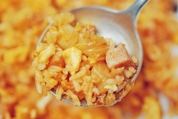 - 放入切件泡菜、切成丁的午餐肉,依然不断翻炒,别忘了倒入泡菜汁,饭会慢慢变红。