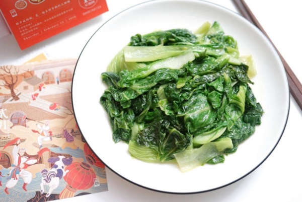 - 锅内放入 20 克油,等油热后放入绣花锦,炒到青菜变软,加入 3 克盐(1 调料勺),2 克糖,再加入 50 克水,翻炒几下,锅边水冒泡就可以盛出了。