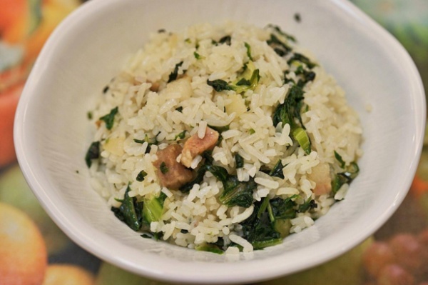 - 100g 咸肉放入开水中烫去表皮浮油,切去皮,然后再切去表层风干部分,切成 1 厘米大小的丁。和生米一起入锅,水米的比例 1:1,煮好后饭粒粒分明,口感很糯。