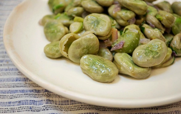 - 锅内倒入 600g 水,加入剥净的蚕豆、香叶、八角和桂皮,冷水煮开,然加入盐 5 调料勺(15g),继续煮 1 分钟,然后把蚕豆捞出,沥干。
