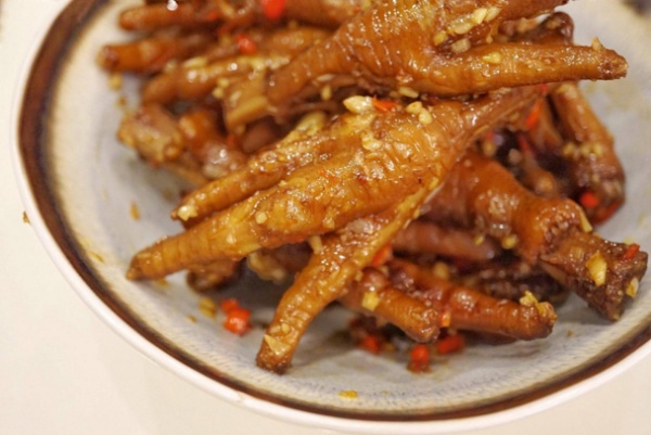 - 小米辣椒 10 个,大蒜 1 整个,京葱 1 节,都切成末,锅内加入 1 瓷勺油,等油热后关火下入蒜末辣椒末,调味吸了油后,转开大火,倒入鸡爪炒 30 秒裹上料。出锅!