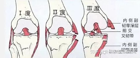 ③内、外侧副韧带:是膝关节两侧的两条长条形韧带结构,主要功能是限制膝关节在运动过程中,胫骨和股骨出现过度分离。内侧副韧带较易受到人为损坏,但是大多数情况下,轻中度损坏本组件后,可自行修复。本组件较易和交叉韧带、半月板等同时被破坏。此外,随着产品的老化,本组件常常发生松弛、退变。