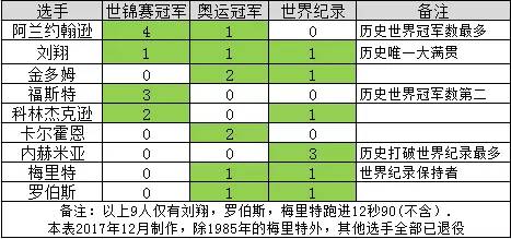 如果只看奥运会 + 世锦赛双料冠军的话,历史上只有阿兰约翰逊和刘翔 2 个人。