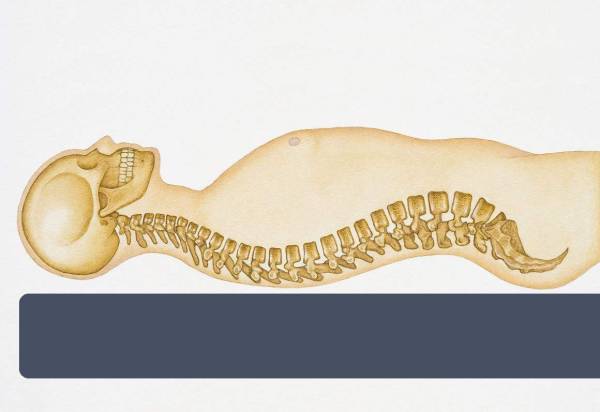 口说无凭,我们通过脊柱在硬床上的受力分析来看。本文主要分析平躺的情况,因为非常悲哀的,在硬床上根本不可能实现侧睡。Fig 1 是一个人体脊柱的侧视图,脊柱处在自然放松的状态,各个方向上受力平衡。