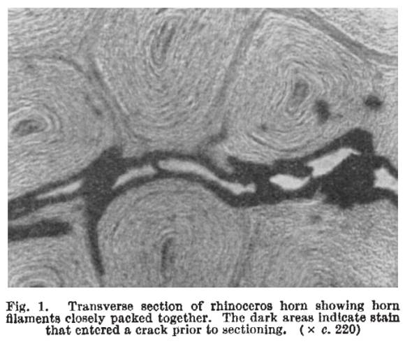 犀牛角呈实心状,本质就是一种角蛋白,是组成人类皮肤角质层的主要构成物质,亦是头发和指甲的主要构成物质。