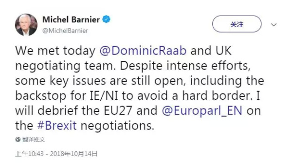然而,在 10 月 14 日,欧盟负责脱欧事务谈判的米歇尔·巴尼耶发布推文表示:“尽管作出了巨大努力,一些关键的事务仍未能得到解决,包括避免爱尔兰和北爱尔兰之间出现‘硬边界’的保障条款。”