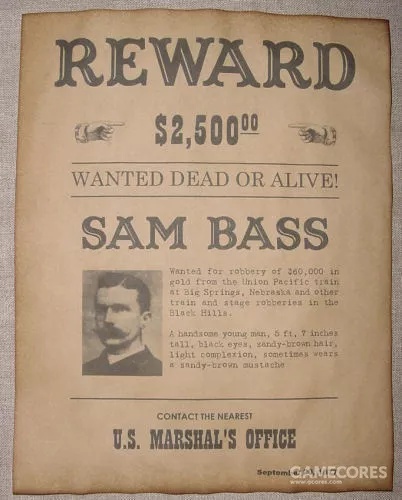 萨姆·巴斯(Sam Bass)是美国西部拓荒时代著名的火车劫匪,犯过很多大案要案。比如著名的联合太平洋铁路公司列车在大斯普林被劫案,可以说是载入史册的案例了。