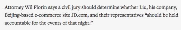 其次,是合理怀疑。美国刑事案件的定罪标准是「排除合理怀疑」(beyond reasonable doubt),而根据澎湃新闻所引用的刘强东律师声明(刘强东律师:房间里发生的一切都是自愿,女方曾反复索要钱财),的确有几处事实可能让陪审团对于是否存在自愿而心生疑虑。(有趣的是,我并没有找到这份据称是由 Jill Brisbois 律师作出的声明的英文版,如果有朋友看到了希望能帮忙甩个链接。)