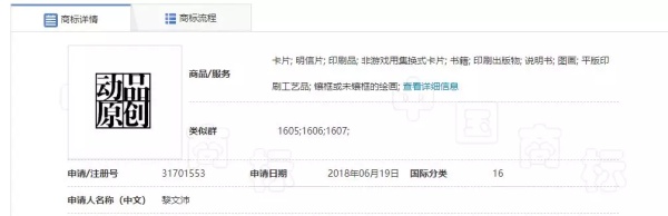 另外,如果在中国商标网上以“动品原创”为关键词进行搜索,也可找到其详细的注册信息,申请人同样为“黎文沛”。