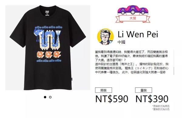 5 月 20 日,优衣库公布了 UTGP 宝可梦主题的 T 恤设计比赛结果,中国设计师“LI WEN PEI”的作品获得了冠军。在获奖感言里,这位设计师写道:“当我看到结果的时候,我觉得自己要疯了,真是难以置信。我反复读了几遍邮件,才确定自己真的是冠军。这怎么可能啊?”